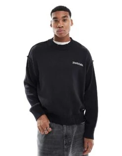 Pull&Bear Back Graphic Knitted Jumper In Washed Black For Men